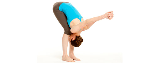 Omekšajte koljena pa se s izdahom polako savijte u pretklon i zabacite ruke isprepletenih prstiju preko glave.