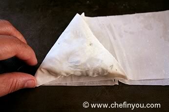 5. Na kraj spojene trake stavite 1 žlicu nadjeva i složite tako, da ispadne trokutić (pogledajte sliku).